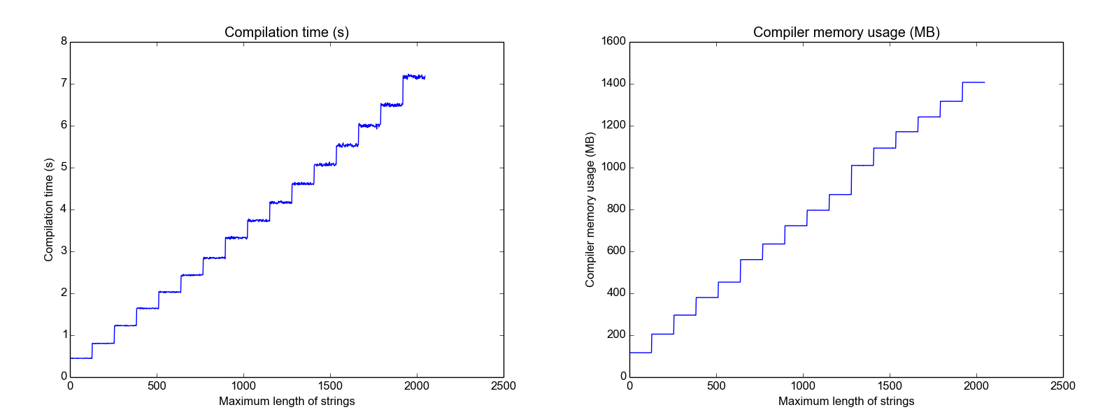 128 strings with increasing length. Measured on a Linux-3.13.0-24-generic-x86_64-with-Ubuntu-14.04-trusty host with 16 GB memory. Compiler used: gcc 4.8.5.