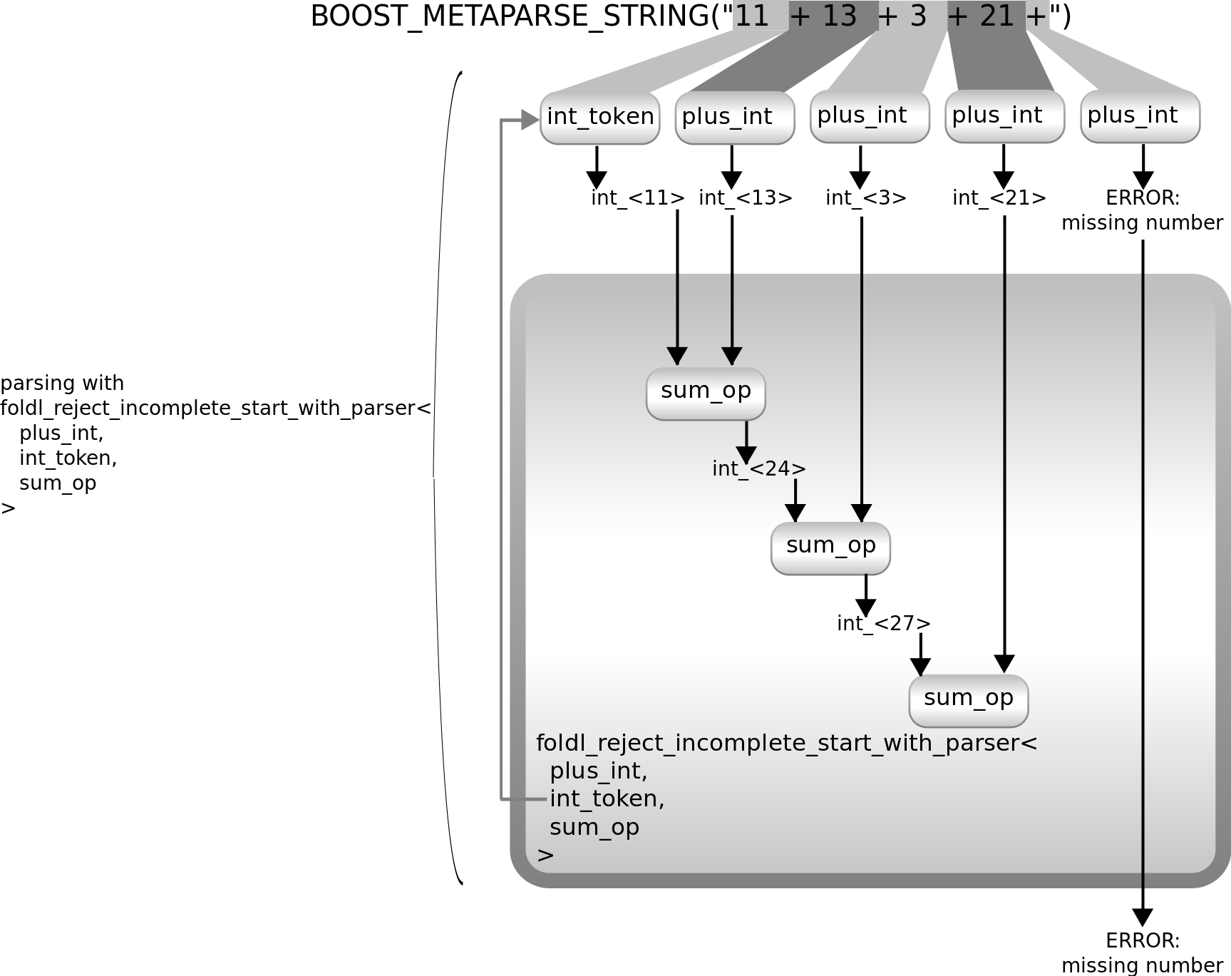 #include <boost/metaparse/token.hpp> #include <boost/metaparse/int_.hpp> #include <boost/metaparse/start.hpp> #include <boost/metaparse/get_result.hpp> #include <boost/metaparse/get_remaining.hpp> #include <boost/metaparse/is_error.hpp> #include <boost/metaparse/string.hpp> #include <type_traits> using namespace boost::metaparse; using int_token = token<int_>; static_assert( get_result< int_token::apply<BOOST_METAPARSE_STRING("13 "), start> >::type::value, "the result of int_token is the number" ); static_assert( std::is_same< BOOST_METAPARSE_STRING(""), get_remaining<int_token::apply<BOOST_METAPARSE_STRING("13 "), start>>::type >::type::value, "token consumes whitespaces after the number" ); static_assert( get_result< int_token::apply<BOOST_METAPARSE_STRING("13"), start> >::type::value, "whitespaces after the number are optional" ); static_assert( is_error<int_token::apply<BOOST_METAPARSE_STRING("foo"), start>>::type::value, "when there is no number, token fails" );